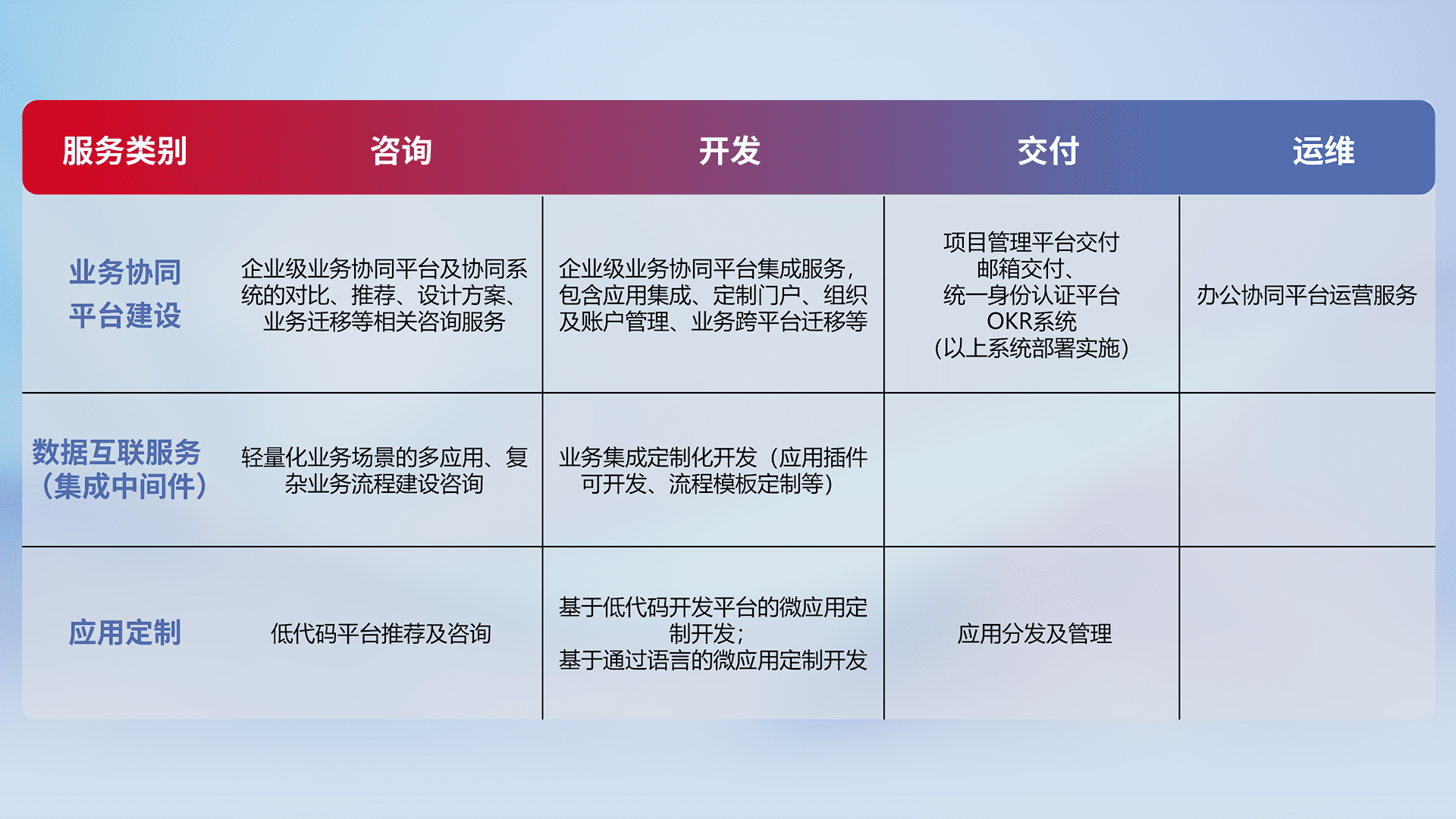 针对钉钉、、、、企微、、IDaas等平台级产品提供产品的规划、、、方案、、、、交付、、、定制化开发等服务,,,实现如统一协同办公、、智能客户服务、、、、混合会议管理、、、、智能数据查询、、等业务场景,,实现数字化转型。。
